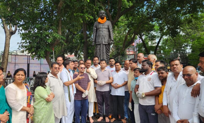 विधायक शिव अरोरा ने महात्मा गाँधी, श्यामा प्रसाद मुखर्जी, दीनदयाल उपाध्याय की मूर्ति की पानी से धोकर उनकी सफाई कर माल्यार्पण किया।