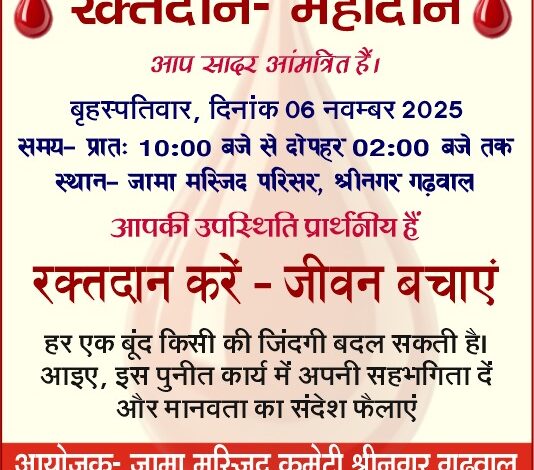 श्रीनगर गढ़वाल। मानवता और सामाजिक एकता का संदेश देने वाला एक ऐतिहासिक आयोजन 6 नवम्बर 2025 बृहस्पतिवार को श्रीनगर गढ़वाल में होने जा रहा है। जामा मस्जिद परिसर श्रीनगर में प्रात-10 बजे से दोपहर 2 बजे तक विशाल रक्तदान शिविर का आयोजन किया जाएगा। इस शिविर का उद्देश्य है रक्तदान करें,जीवन बचाएं-क्योंकि हर दान की गई बूंद किसी जरूरतमंद की जिंदगी बचा सकती है। यह प्रेरणादायी आयोजन जामा मस्जिद कमेटी श्रीनगर के सहयोग से किया जा रहा है,जिसमें बेस अस्पताल श्रीकोट की ब्लड बैंक टीम सक्रिय सहयोग प्रदान करेगी। इस पुनीत कार्य के माध्यम से श्रीनगर नगर में मानवीय संवेदना,आपसी सद्भाव और सामाजिक जिम्मेदारी का एक सुंदर संदेश प्रसारित किया जाएगा। मानवता की मिसाल बनेगा श्रीनगर-कार्यक्रम आयोजकों का कहना है कि यह रक्तदान शिविर केवल एक स्वास्थ्य पहल नहीं,बल्कि मानवता की सेवा का उत्सव है। इस अवसर पर नगर के विभिन्न सामाजिक संगठनों,व्यापारिक प्रतिनिधियों,शिक्षकों,युवाओं और छात्र-छात्राओं से रक्तदान के लिए विशेष अपील की गई है। रक्तदान एक ऐसा दान है जो जीवन देता है,किसी की मुस्कान लौटाता है और इंसानियत को नई परिभाषा देता है। आयोजकों ने कहा बेस अस्पताल की विशेषज्ञ टीम करेगी रक्त संग्रहण-शिविर में बेस अस्पताल श्रीकोट की ब्लड डिपार्टमेंट टीम द्वारा सभी रक्तदाताओं का स्वास्थ्य परीक्षण,रक्त संग्रहण किया जाएगा। विशेषज्ञ चिकित्सक पूरी निगरानी में यह प्रक्रिया संचालित करेंगे ताकि रक्तदाताओं को सुरक्षित और स्वच्छ वातावरण में दान करने का अनुभव प्राप्त हो। जामा मस्जिद कमेटी की प्रेरक पहल-जामा मस्जिद कमेटी श्रीनगर के पदाधिकारियों ने बताया कि मस्जिद परिसर में यह शिविर आयोजित कर साम्प्रदायिक सौहार्द,सामाजिक एकता और मानवीय सेवा का संदेश दिया जा रहा है। समिति ने नगरवासियों से अधिकाधिक संख्या में पहुंचकर इस रक्त महादान में सहभागी बनने की अपील की है। रक्तदान सच्ची इंसानियत की पहचान-आयोजकों का कहना है कि हर व्यक्ति समाज के प्रति अपने उत्तरदायित्व को निभा सकता है और रक्तदान इसका सर्वोत्तम उदाहरण है। रक्तदान न केवल किसी जरूरतमंद की जान बचाता है बल्कि दाता के भीतर सेवा,करुणा और आत्मसंतोष की भावना भी उत्पन्न करता है। जीवन का सबसे बड़ा उपहार रक्तदान 6 नवम्बर को आयोजित इस शिविर में नगर के युवाओं,महिलाओं,शिक्षकों और समाजसेवियों की भागीदारी अपेक्षित है। प्रशासनिक और स्वास्थ्य विभाग के अधिकारी भी इस महादान में अपनी उपस्थिति दर्ज कराएंगे। हर बूंद मायने रखती है-आपका एक कदम किसी परिवार की दुनिया रोशन कर सकता है।