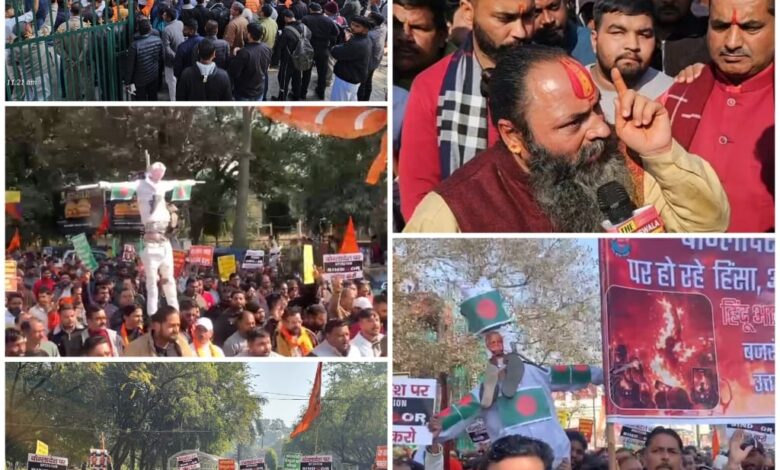 बांग्लादेश में लगातार हो रहे हिंदुओं पर लक्षित हिंसा दमन अत्याचारों के विरोध में गांधी पार्क से घंटाघर तक मार्च निकल कर हिंदू समाज ने विरोध प्रदर्शन किया । जिसमें भरी संख्या में लोगों ने आकर बांग्लादेश और इस्लामिक जिहाद पर अपना आक्रोश व्यक्त किया । प्रदर्शन की अल्पसूचना विश्व हिंदू परिषद बजरंग दल द्वारा की गई थी। परंतु साधु संतों एवं व्यापारी वर्ग और हिन्दू समाज के सभी वर्गों के लोग इस आक्रोश मार्च में सम्मिलित हुए सभी सनातनी बांग्लादेश में होने वाली हिंदुओं पर हिंसा और हत्या किए गए दीपू दास को अपने परिवार का सदस्य मानकर इस आक्रोश मार्च में उपस्थित हुए । विहिप प्रांत अध्यक्ष रविदेव आनंद ने हिन्दुओं का आह्वान करते हुए कहा कि अब हिंदुओं के पास विकल्प नहीं है हम सबको ऐसे जिहादी मानसिकता के लोगो का संपूर्ण बहिष्कार करना होगा। प्रांत अर्चक पुरोहित प्रमुख सुभाष जोशी ने कहा कि अपने बच्चों को शास्त्र पढ़ाए शास्त्रों के अध्ययन करने से समाज सबल बनेगा, बजरंग दल के प्रांत साप्ताहिक मिलन प्रमुख बजरंग दल विकास वर्मा ने अपने संबोधन में कहा की इस्लामिक जिहादियों द्वारा पूरी विश्व भर में इसी घटनाओं को अंजाम दिया जा रहा है। मरे कोई मारने वाला हर जगह ही ये जिहादी है ही है,अब हिन्दू समाज की ये लड़ाई आर पार की लड़नी होगी नहीं तो समाज का अस्तित्व संकट में है।विभाग मंत्री आलोक सिन्हा सह विभाग संगठन मंत्री अक्षत राणाकोटी ने बताया की संगठन द्वारा पूरे देश आक्रोश प्रदर्शन की योजना थी किया बजरंग दल संयोजक अमन स्वेडिया ने कहा कि देहरादून में भी ऐसे जिहादियों का आर्थिक बहिष्कार जरूरी है। अध्यक्ष अनिल मेसोन मंत्री विशाल चौधरी एवं देहरादून उत्तर जिला अध्यक्ष माधव मैथानी मंत्री श्याम शर्मा, यशवंत मौर्य सौरभ गौतम राजेश सोमवंशी, हर्ष सहगल, शशांक घिड़िय्याल, प्रेम सेठी, ललिता शर्मा, मीनू दीढा़न,गौरव तोमर, अमन राजवंशी अखिलेश अग्रवाल यशवर्धन मौर्य ,अंकुश प्रजापति, सोनू गुप्ता ,राधे गुप्ता, सुरेश गुप्ता, संदीप वाधवा, मनोज जुनेजा, हितेश, दीपांकर, साहनी, सचिन गुजराती,सक्षम,लखन खन्ना, आशीष बलूनी, अभिषेक सोनकर हरीश सेठी, शेर सिंह थपली सुरेंद्र मित्तल,योगेश कुकरेती पिछड़ा आयोग पूर्व अध्यक्ष अशोक वर्मा पुनीत मित्तल, स्वामी योगेश्वरानंद, सरदार सोनी, राशिराम वर्मा अशोक वर्मा , वशिष्ठ, अजय भारती , प्रीति शुक्ला, राजकुमार चौहान,अर्चित रावत ,करन राणा,मदन पंवार , विक्रम सिंह, विवेक, अमर चौधरी, कपिल गोगिया ,बड़ी संख्या में मातृशक्ति एवं सनातन समाज के लोग उपस्थित हुए।
