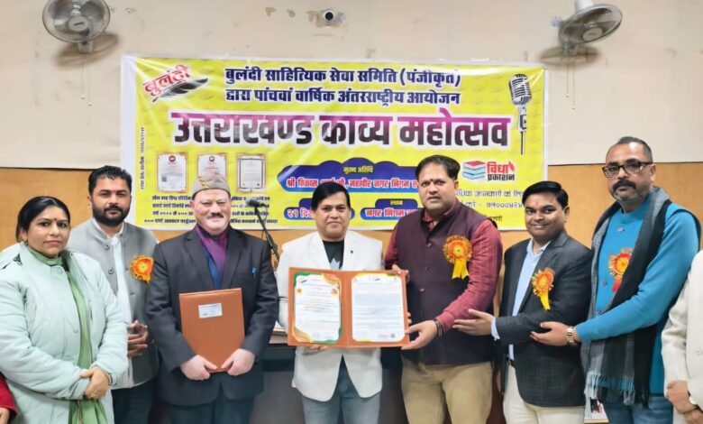 उत्तराखंड काव्य महोत्सव में कवि अशोक अंजाना सम्मानितरुद्रपुर।बुलंदी साहित्यिक सेवा समिति द्वारा आयोजित उत्तराखण्ड काव्य महोत्सव पांचवें वार्षिक अंतरराष्ट्रीय आयोजन में सम्मानित हुए शहर के अशोक अंजानाआयोजन का शुभारंभ रुद्रपुर नगर निगम के महापौर श्री विकास शर्मा जी द्वारा दीप प्रज्वलन कर किया गया। इस अवसर पर रुद्रपुर निवासी वरिष्ठ कवि अशोक अंजाना को उनके साहित्यिक योगदान के लिए “साहित्य शिरोमणि सम्मान” से सम्मानित किया गया। यह सम्मान महापौर श्री विकास शर्मा जी के करकमलों द्वारा प्रदान किया गया।कार्यक्रम में इंडोनेशिया से सुषमा श्रीवास्तव नेपाल से रमेश पंत , हेमबाबू लेखक , खेमानंद बड़ू सहित भारत के विभिन्न प्रांतों के साहित्यकारों की गरिमामयी उपस्थिति रही, जिससे आयोजन को अंतरराष्ट्रीय स्वरूप प्राप्त हुआ।उक्त आयोजन में बुलंदी साहित्यिक सेवा समिति के संस्थापक विवेक बादल बाज़पुरी सहित भारतीय जनता पार्टी युवा मोर्चा के जिला अध्यक्ष श्री बिट्टू चौहान जी सहित नीलेश निराला , नवी दर बदर , सत्यार्थ , जगमोहन जगमोरा उपस्थित रहे lकार्यक्रम में काव्य पाठ, साहित्यिक संवाद एवं सम्मान समारोह के माध्यम से साहित्य और संस्कृति के संवर्धन का संदेश दिया गया।