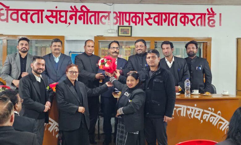 फोटो – नैनीताल जिला बार सभागार में पहुंचे जिलाधिकारी का अभिवादन करते बार संघ के पदाधिकारी।