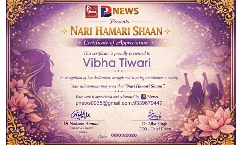 नारी हमारी शान 2026 से पुरस्कृत हुई समाजसेविका विभा तिवारी